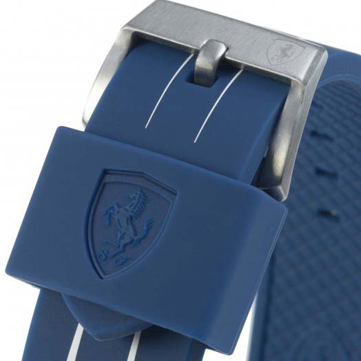 Capturing all the thrills of race day with its tire-design crown, Pit Crew adds new 3-hand bracelet models with bold links made of silicon-wrapped TR90, a high tech thermoplastic composite prized for its light weight and rich color. New designs feature graphic new stylized stripe straps suggested by an aerial view of the Abu-Dhabi Ferrari World theme park, or the Racing Shield logo on the strap upper half, mimicking the position of the shield on the sides of the racing cars.